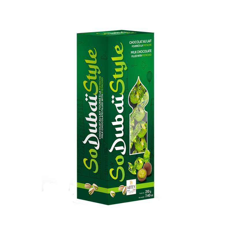 5De généreuses boules de chocolat au lait renfermant un cœur fondant à la crème de pistache, offrant un mariage raffiné entre la douceur du chocolat et l’onctuosité subtile de la pistache, pour une gourmandise au style unique qui évoque l’élégance et la richesse des saveurs de Dubaï.