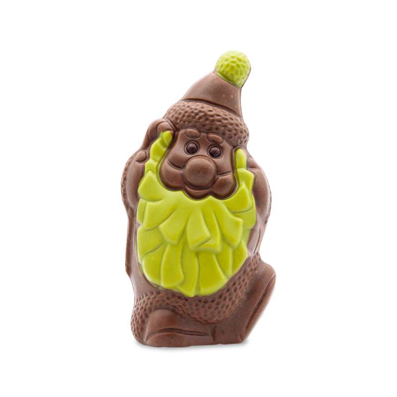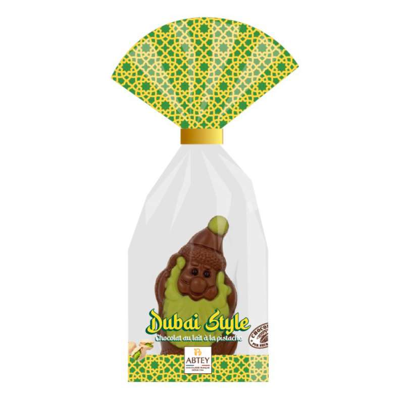 Découvrez notre Père Noel Dubaï Style avec un chocolat au lait mélangé à de la délicieuse pistache, offrant un mariage raffiné entre la douceur du chocolat et l’onctuosité subtile de la pistache, pour une gourmandise au style unique qui évoque l’élégance et la richesse des saveurs de Dubaï.