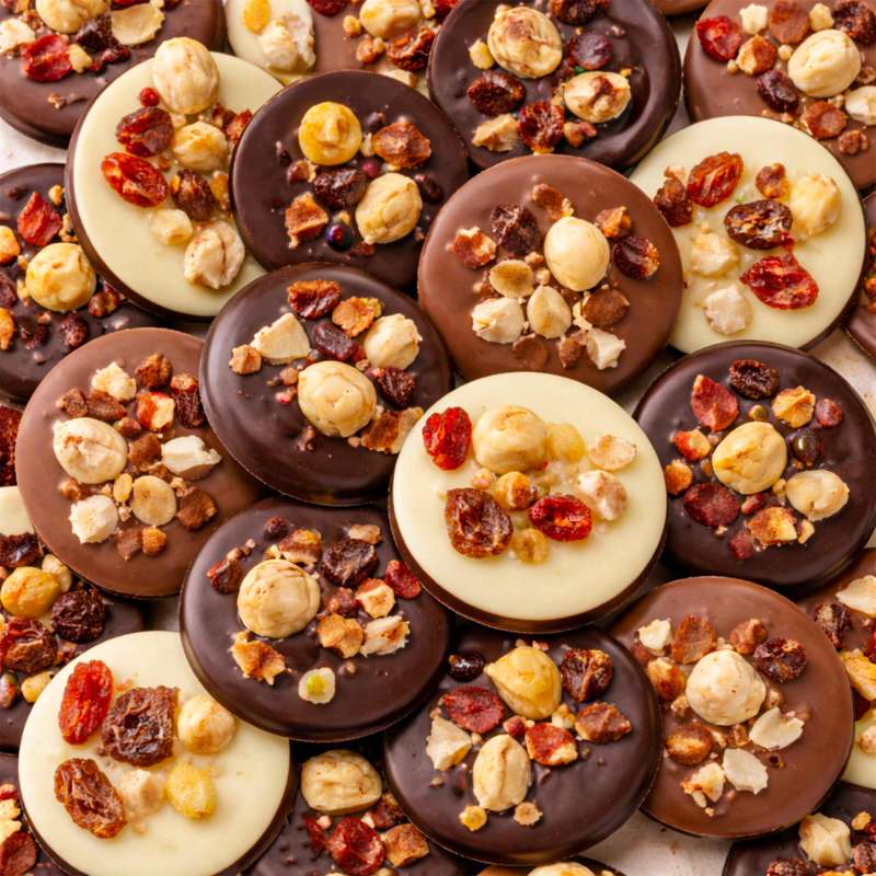 Ingrédients : Sucre, Beurre de cacao, pâte de cacao, Lait entier en poudre, Noisette, Amande, cube de papaye (séchée, sucre, conservateur : anhydride sulfureux), Citron confit (Citron 52%, Sirop de glucose, Fructose, Correcteur d'acidité E330, conservateur E202, E220), Noix de pécan, Orange confite (Orange, sirop de glucose, fructose, correcteur d'acidité E330, conservateur E202, E220), Abricot sec, Lactoserum en poudre, Lactose, Lécithine de tournesol, Extrait de vanille.