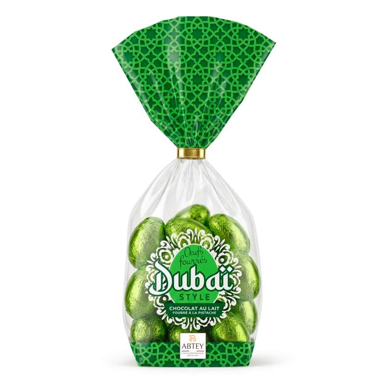 De généreux oeufs de chocolat au lait renfermant un cœur fondant à la crème de pistache, offrant un mariage raffiné entre la douceur du chocolat et l’onctuosité subtile de la pistache, pour une gourmandise au style unique qui évoque l’élégance et la richesse des saveurs de Dubaï.