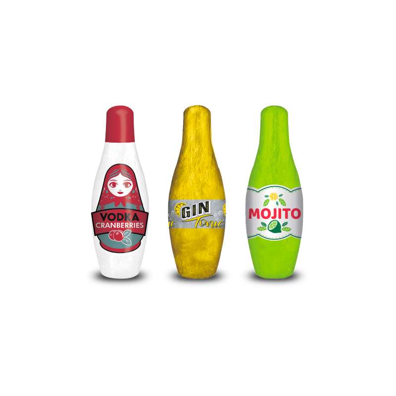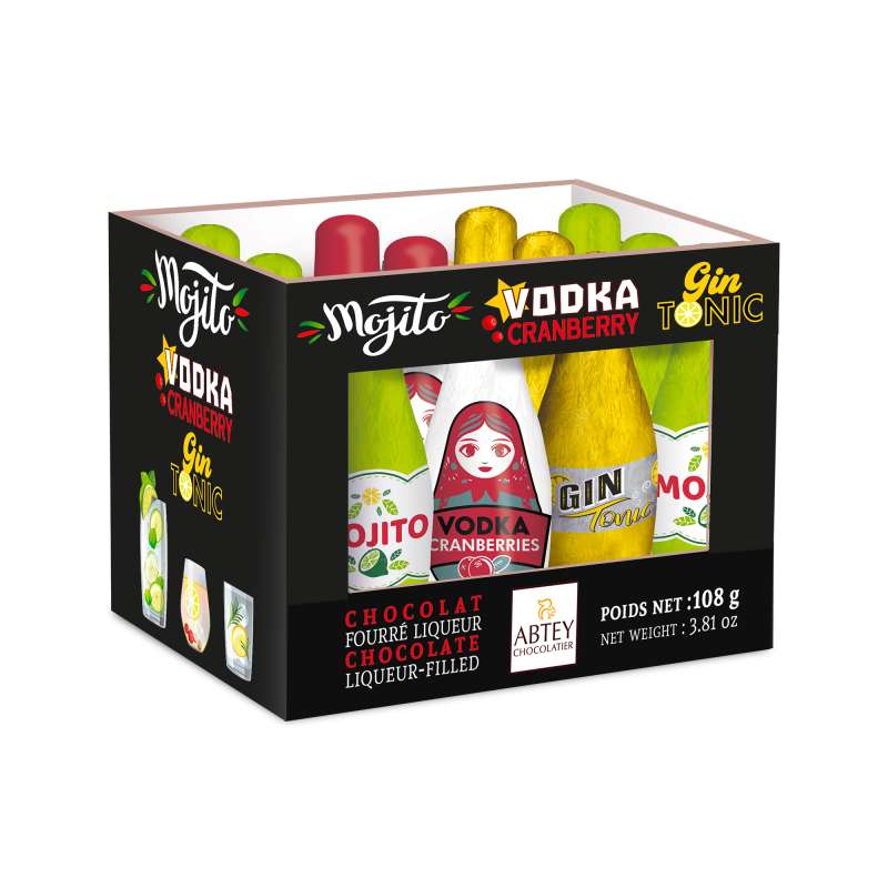 Sucre, sirop de sucre inverti, pâte de cacao, beurre de cacao, Rhum blanc (2.23%), alcool, Vodka (1.37%), Gin (1.16%), émulsifiant : lécithines, extrait de vanille ).
