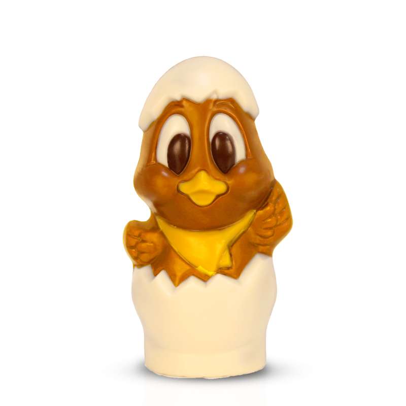 Voici notre adorable Chick le poussin tout juste sortis de sa coquille au chocolat. Moulage au chocolat aromatisé au caramel, une gourmandise parfaite pour les enfants !